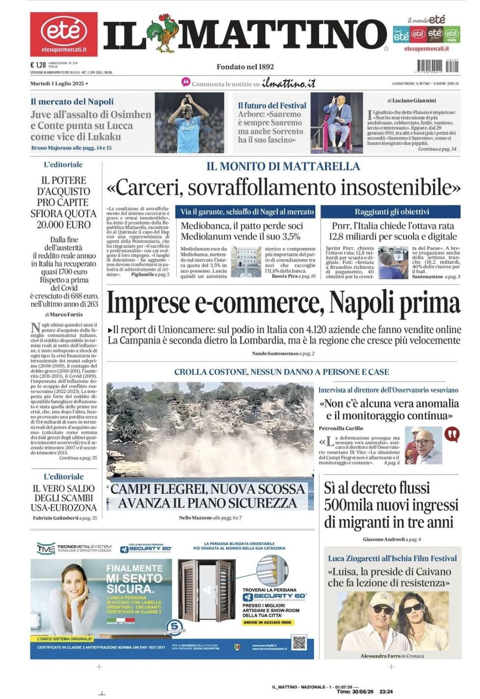 "Juve all'assalto di Osimhen e Conte punta Lucca come vice di Lukaku", scrive così nell'edizione odierna Il Mattino in prima pagina in taglio alto, facendo il punto sulla questione centravanti in casa Napoli. Di seguito la prima pagina integrale.
