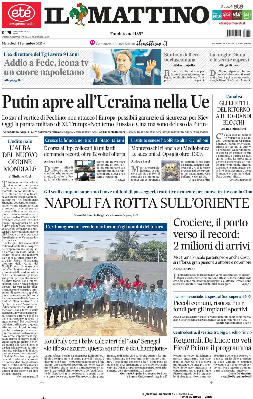Nell'edizione di oggi, Il Mattino dedica spazio in prima pagina ad un'intervista esclusiva a Kalidou Koulibaly, ex difensore del Napoli che inaugura un'accademia calcio in Senegal: "Koulibaly con i baby calciatori del 'suo' Senegal: 'Io tifo azzurro, questa squadra è da Champions'". In taglio la scomparsa di Emilio Fede: "Addio a Fede, icona della tv: un cuore napoletano". Di seguito la prima pagina integrale.