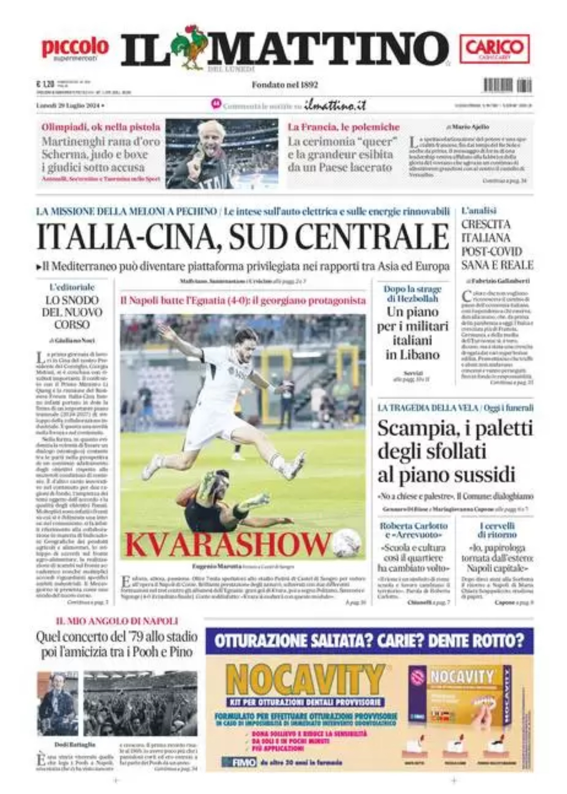 Nell'edizione di oggi, Il Mattino apre in prima pagina con l'ottima prestazione di Kvaratskhelia nella prima amichevole del Napoli a Castel di Sangro: "Kvarashow. Il Napoli batte l'Egnanatia (4-0): il georgiano protagonista". Di seguito la prima pagina integrale.