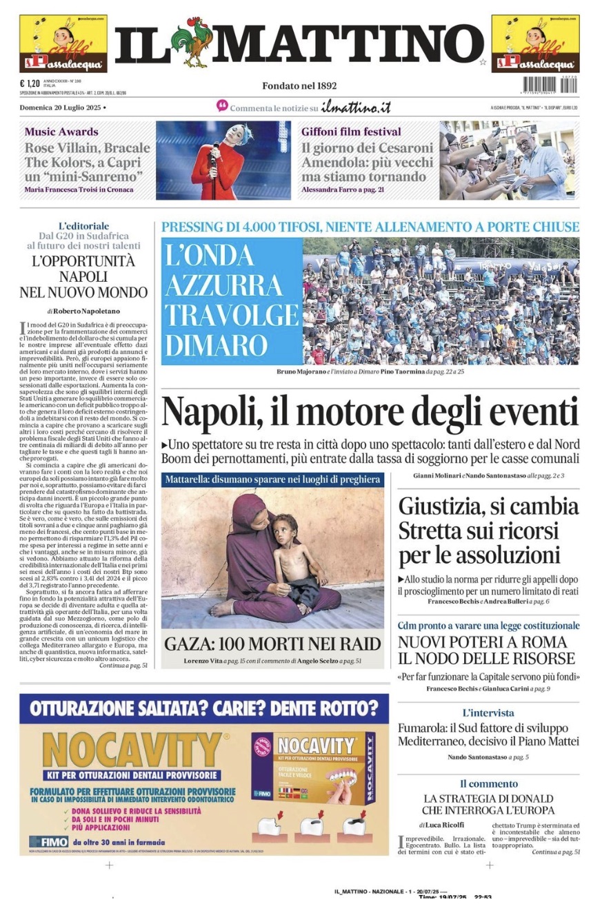 "L'onda azzurra travolge Dimaro", apre così in prima pagina Il Mattino nell'edizione odierna, parlando dei supporter partenopei che in numerosi si sono recati in Val di Sole per il ritiro di preparazione estiva del Napoli. Il sommario: "Pressing di 4000 tifosi, niente allenamento a porte chiuse". Di seguito la prima pagina integrale.