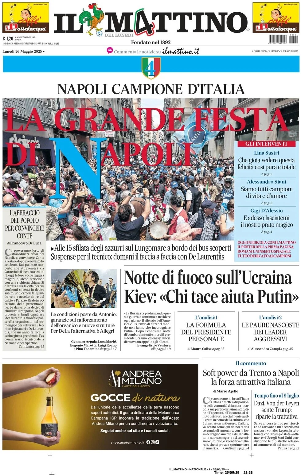 Nell'edizione di oggi, Il Mattino apre in prima pagina con la grande festa che ci sarà sul lungomare per il quarto scudetto conquistato dal Napoli: "La grande festa di Napoli. Alle 15 sfilata degli azzurri sul Lungomare a bordo dei bus scoperti". C'è spazio anche per il futuro di Antonio Conte: "Suspence per il tecnico: domani il faccia a faccia con De Laurentiis". Di seguito la prima pagina integrale.