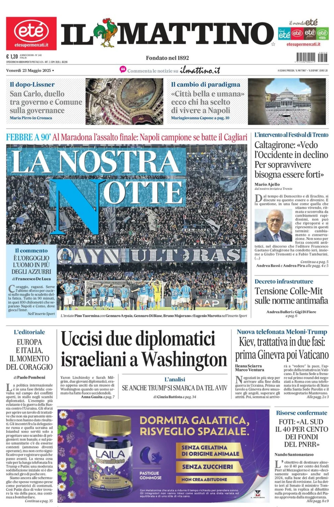 Nell'edizione di oggi, Il Mattino dedica l'apertura in prima pagina alla sfida scudetto che attende il Napoli questa sera al Maradona contro il Cagliari: "La nostra notte. Febbre a 90’. Al Maradona l'assalto finale: Napoli campione se batte il Cagliari”. Di seguito la prima pagina integrale.