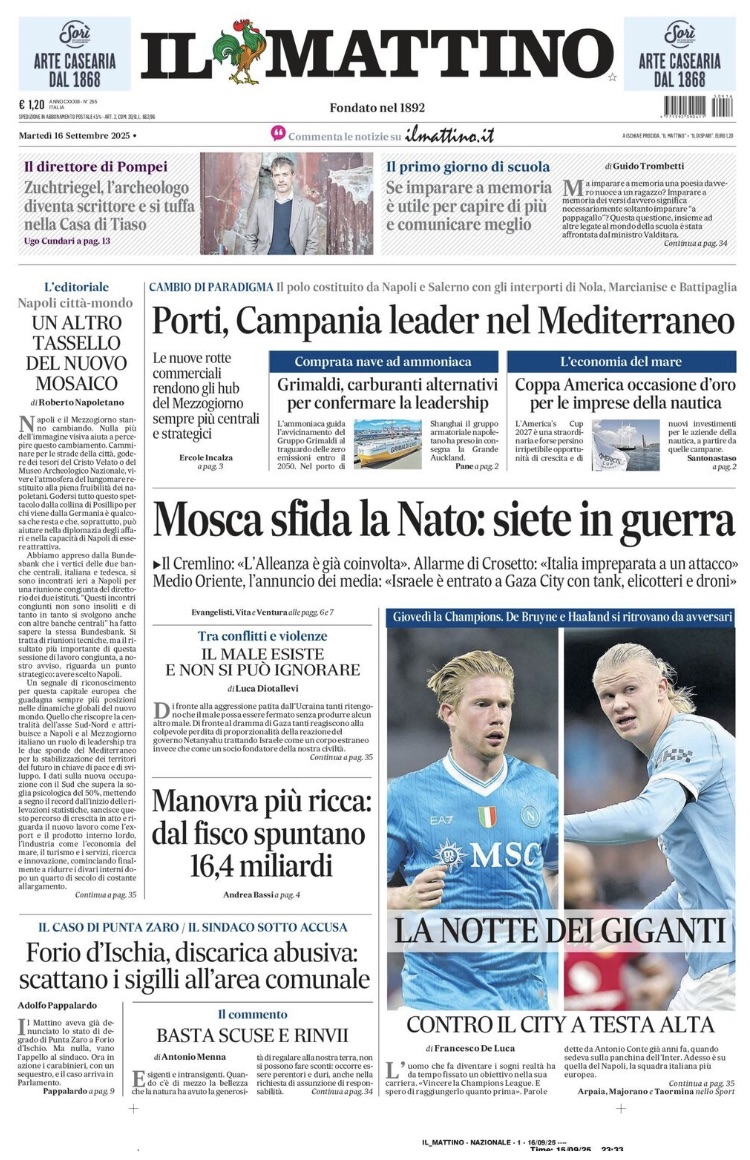 "La notte dei giganti", scrive così in prima pagina Il Mattino nell'edizione odierna, parlando dell'imminente match dell'Etihad Stadium tra Manchester City e Napoli. Il sommario: "Giovedì la Champions, De Bruyne e Haaland si ritrovano da avversari". Di seguito la prima pagina integrale.