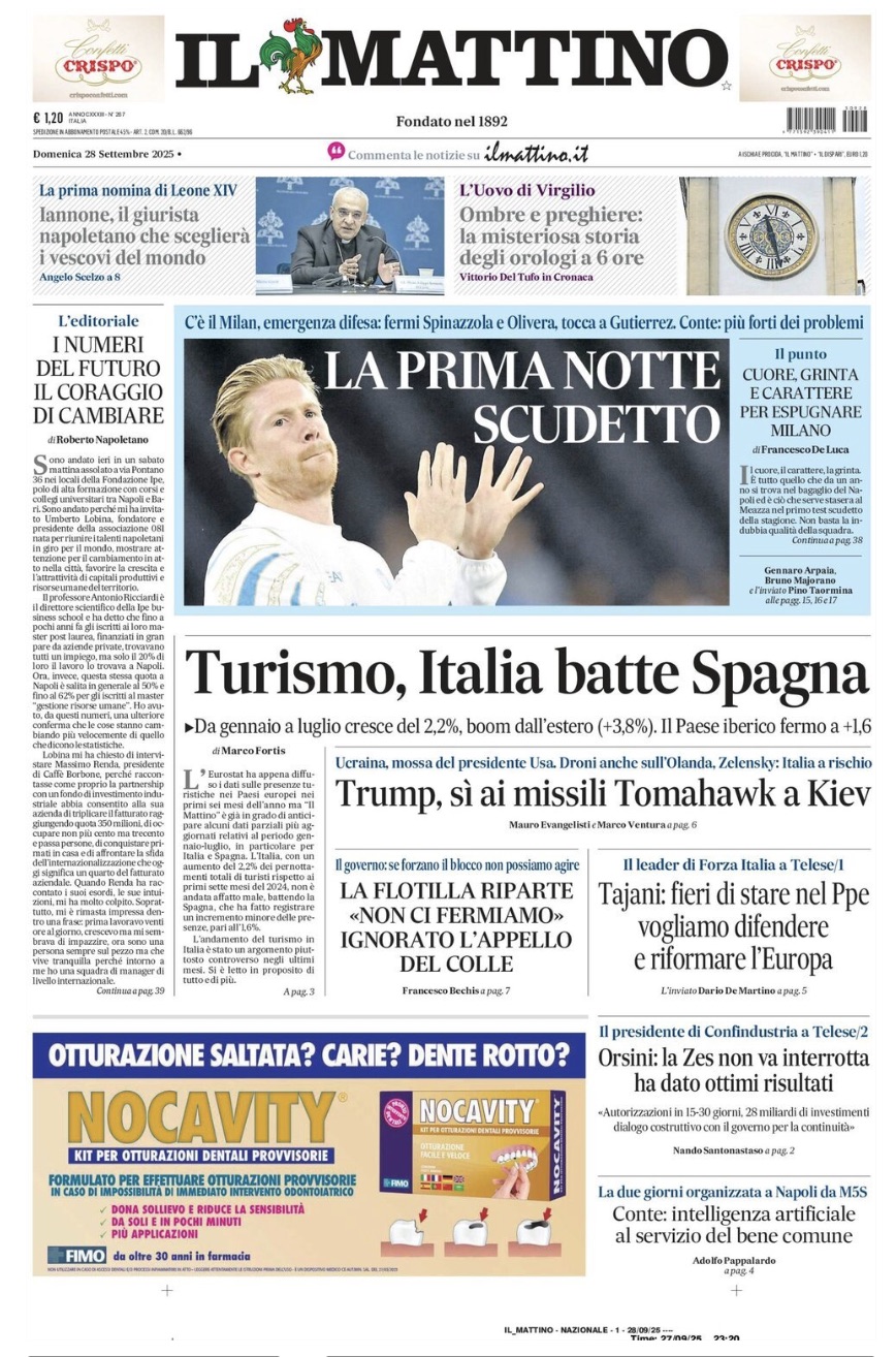"La prima notte Scudetto", apre così in prima pagina Il Mattino nell'edizione odierna, parlando dello scontro al vertice di questa sera contro i rossoneri di Massimiliano Allegri. Il sommario: "C'è il Milan, emergenza difesa: fermi Spinazzola e Olivera, tocca a Gutierrez. Conte: «più forti dei problemi»". Di seguito la prima pagina integrale.