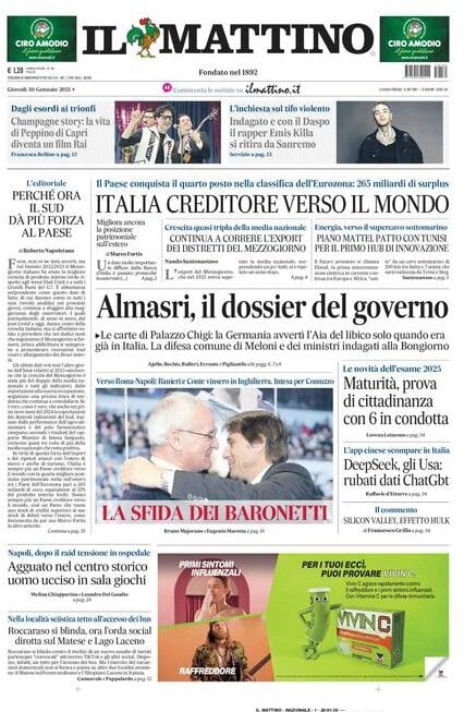 Nell'edizione di oggi, Il Mattino dedica spazio in prima pagina al Derby del Sole di domenica tra Roma e Napoli: "La sfida dei baronetti. Verso Roma-Napoli: Ranieri e Conte vinsero in Inghilterra. Intesa per Comuzzo". In taglio alto spazio al film sulla vita di Peppino di Capri: "Champagne story: la vita di Peppino di Capri diventa un film Rai".