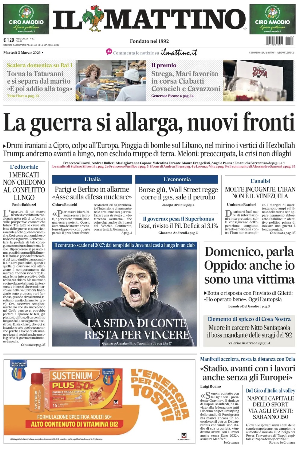 "La sfida di Conte: resta per vincere", scrive così in prima pagina Il Mattino nell'edizione odierna, parlando del futuro dell'allenatore del Napoli. Il sommario: "Il contratto scade nel 2027: dai tempi della Juve mai così a lungo in un club". In taglio basso, una parentesi sul Maradona con le parole del Sindaco Manfredi: "Stadio, avanti con i lavori anche senza gli Europei". Di seguito la prima pagina integrale.