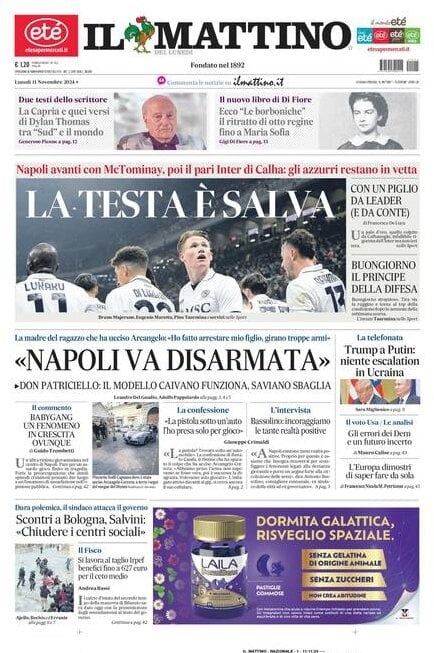 Nell'edizione di oggi, Il Mattino apre in prima pagina col pari tra Inter e Napoli che permette agli azzurri di mantenere il primo posto in classifica: "La testa è salva. Napoli avanti con McTominay, poi il pari dell'Inter di Calha: gli azzurri restano in vetta". Di seguito la prima pagina integrale.