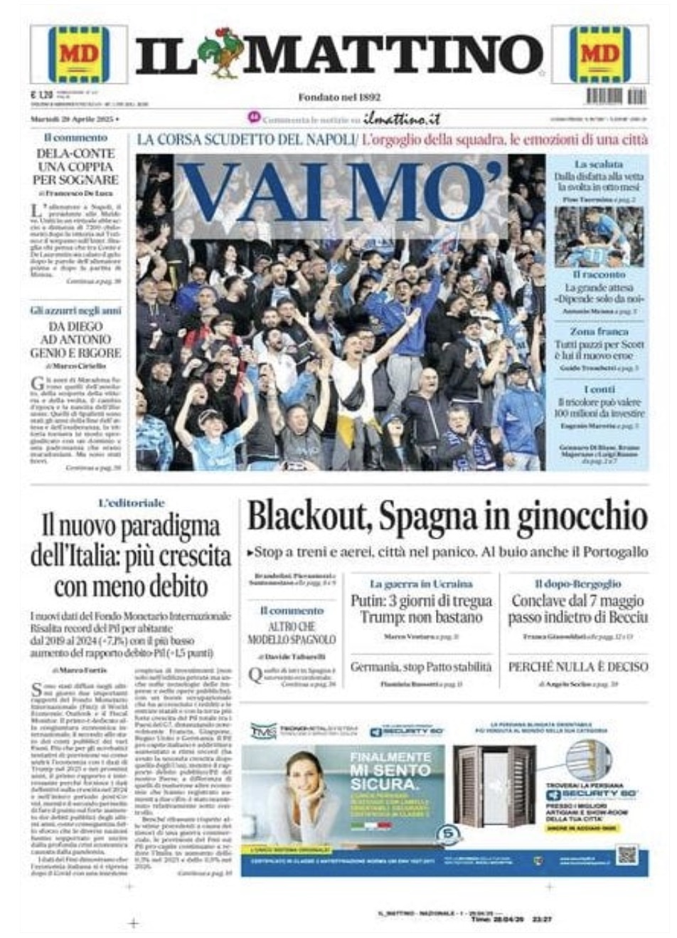 "Vai mo'", apre così in prima pagina Il Mattino nell'edizione odierna, sottolineando che sia questo il momento in cui gli azzurri devono mantenere il passo per conquistare il tricolore. Il sommario: "La corsa Scudetto del Napoli. L'orgoglio della squadra, le emozioni di una città". In spalla ancora si legge, facendo riferimento al decimo posizionamento dello scorso anno: "La scalata. Dalla disfatta alla vetta: la svolta in otto mesi". Di seguito la prima pagina integrale.