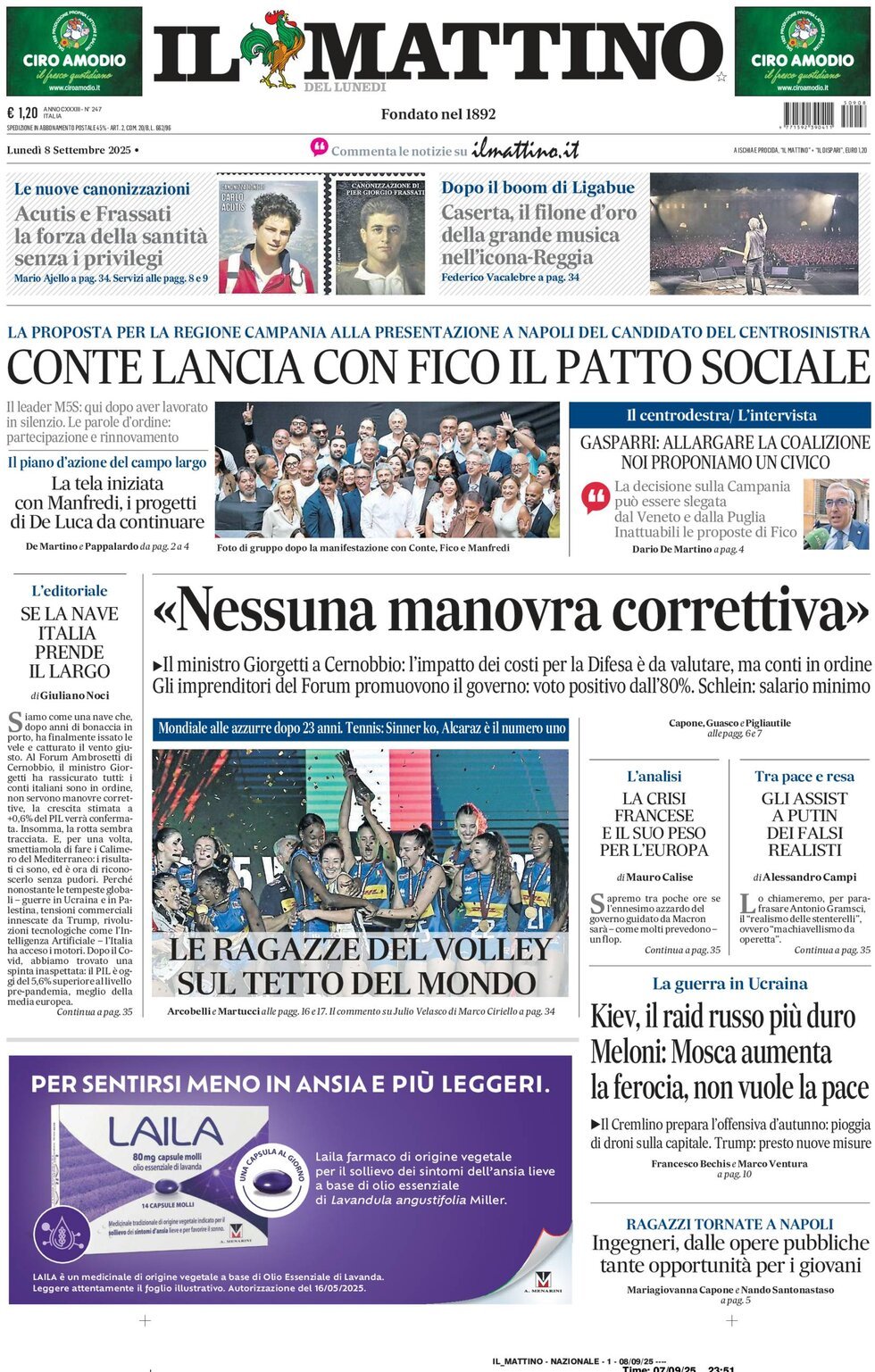 Nell'edizione di oggi, Il Mattino dedica ampio spazio al trionfo ai Mondiali in Tailandia della Nazionale femminile di pallavolo: "Le ragazze del volley sul tetto del mondo. Mondiale alle azzurre dopo 23 anni". C'è spazio anche per la finale degli Us Open di tennis con Sinner che perde contro Alcaraz: "Sinner ko, Alcaraz è il numero uno". Di seguito la prima pagina integrale.