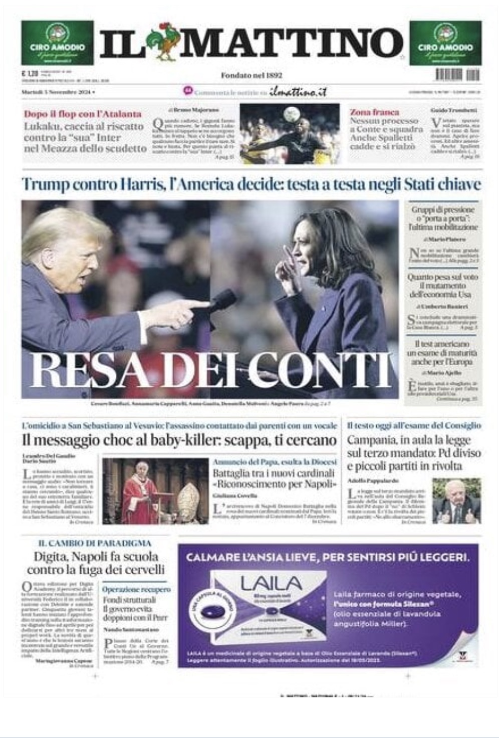"Dopo il flop con l'Atalanta. Lukaku, caccia al riscatto contro la "sua" Inter nel Meazza dello scudetto", apre così in prima pagina l'edizione odierna de Il Mattino, parlando del centravanti belga che affronterà la sua ex squadra domenica prossima. Spazio anche alla sconfitta degli azzurri nella scorsa gara: "Zona franca. Nessun processo a Conte e squadra. Anche Spalletti cadde e si rialzò". Di seguito la prima pagina integrale.