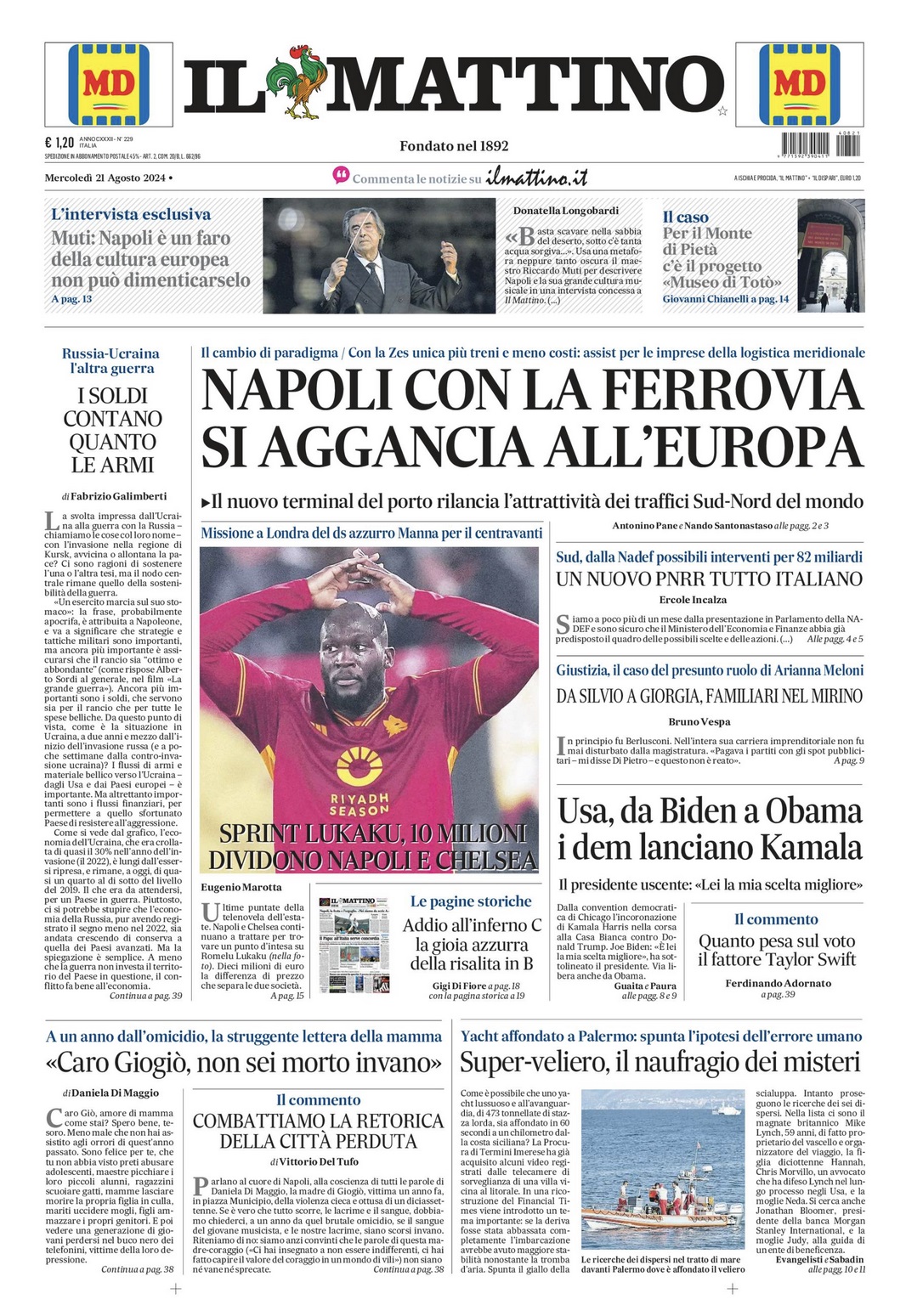 Nell'edizione di oggi, Il Mattino dedica spazio al mercato del Napoli in prima pagina: "Sprint Lukaku, 10 mln dividono Napoli e Chelsea. Missione a Londra del ds azzurro Manna per il centravanti". In apertura il nuovo termina del porto: "Napoli con la ferrovia si aggancia all'Europa". Di seguito la prima pagina integrale.
