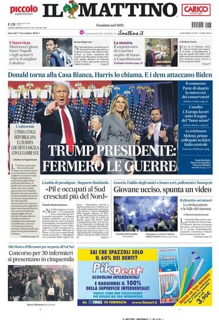Nell'edizione di oggi, Il Mattino dedica spazio al big match di domenica tra Inter e Napoli con l'intervista all'ex nerazzurro Marco Materazzi: "Agli azzurri serve il miglior Lukaku". In apertura spazio alle elezioni americane: "Trump presidente: Fermerò le guerre". Di seguito la prima pagina integrale.