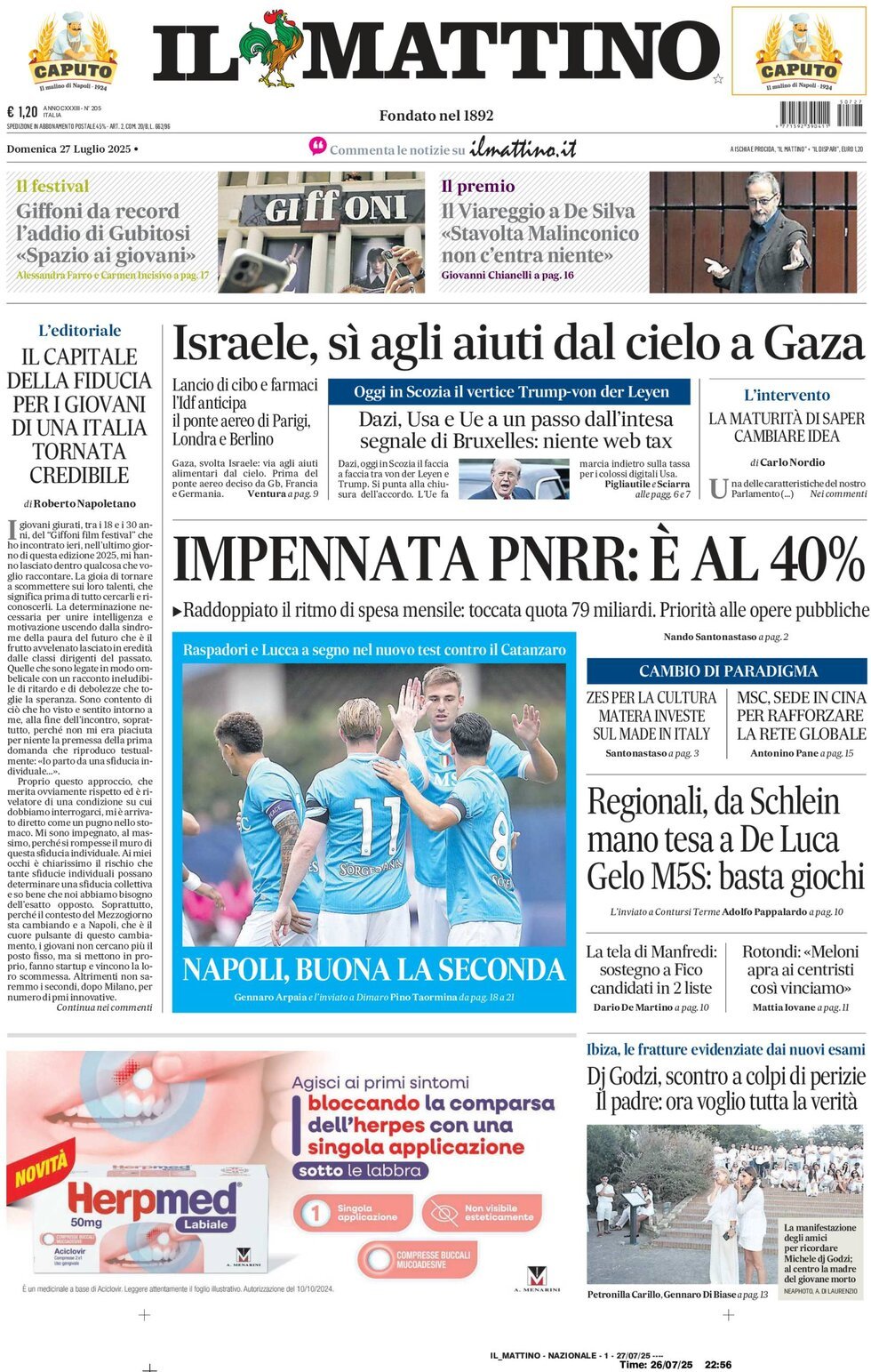 Nell'edizione di oggi, Il Mattino dedica spazio in prima pagina alla vittima del Napoli nel secondo e ultimo test amichevole del ritiro di Dimaro-Folgarida: "Napoli, buona la seconda. Raspadori e Lucca a segno nel nuovo test contro il Catanzaro". Di seguito la prima pagina integrale.