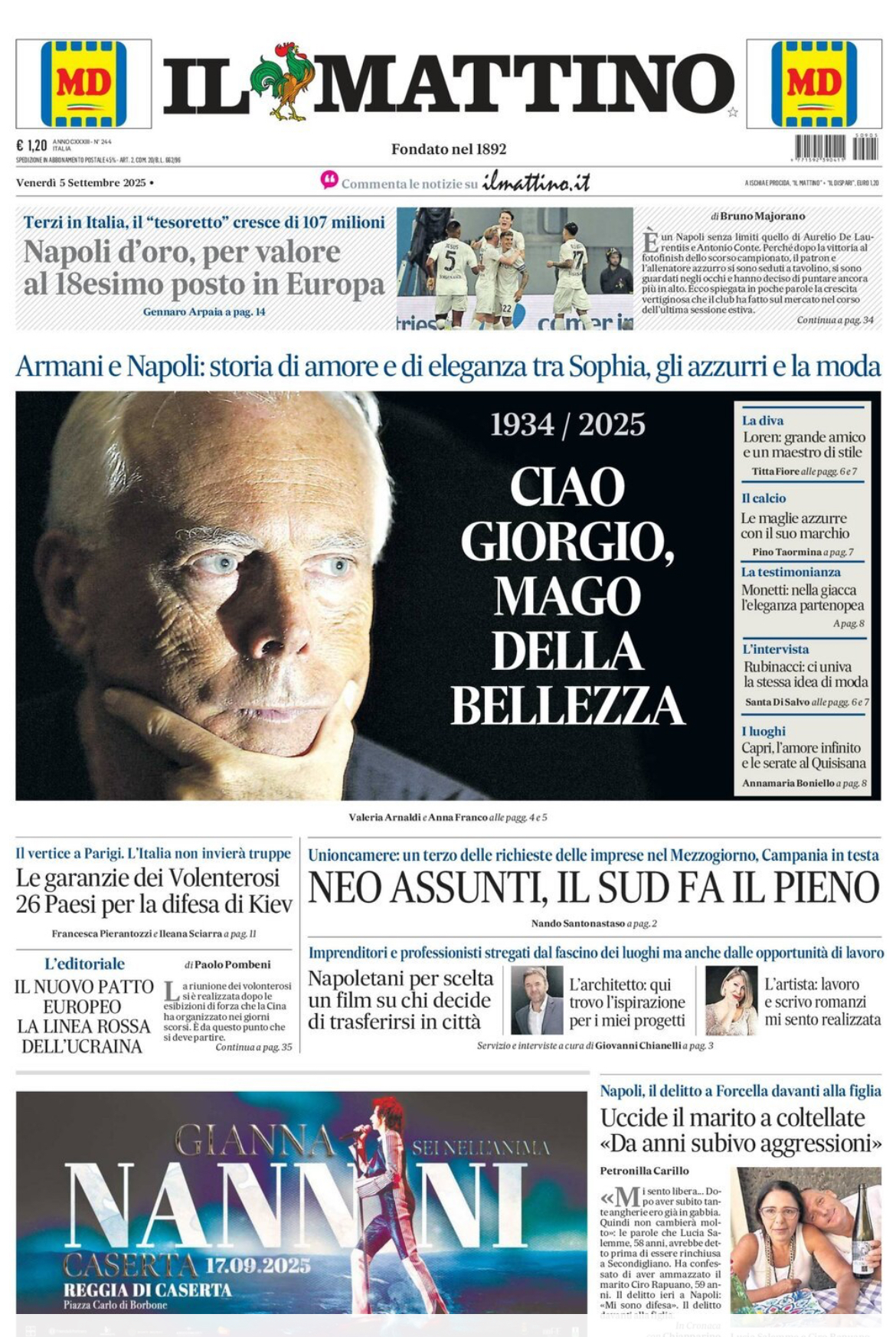 Nell'edizione odierna, Il Mattino apre in taglio alto con il Napoli e con il valore della rosa: “Napoli d’oro, per valore al 18esimo posto in Europa. Terzi in Italia, il ‘tesoretto’ cresce di 107 milioni”. Di seguito la prima pagina integrale.