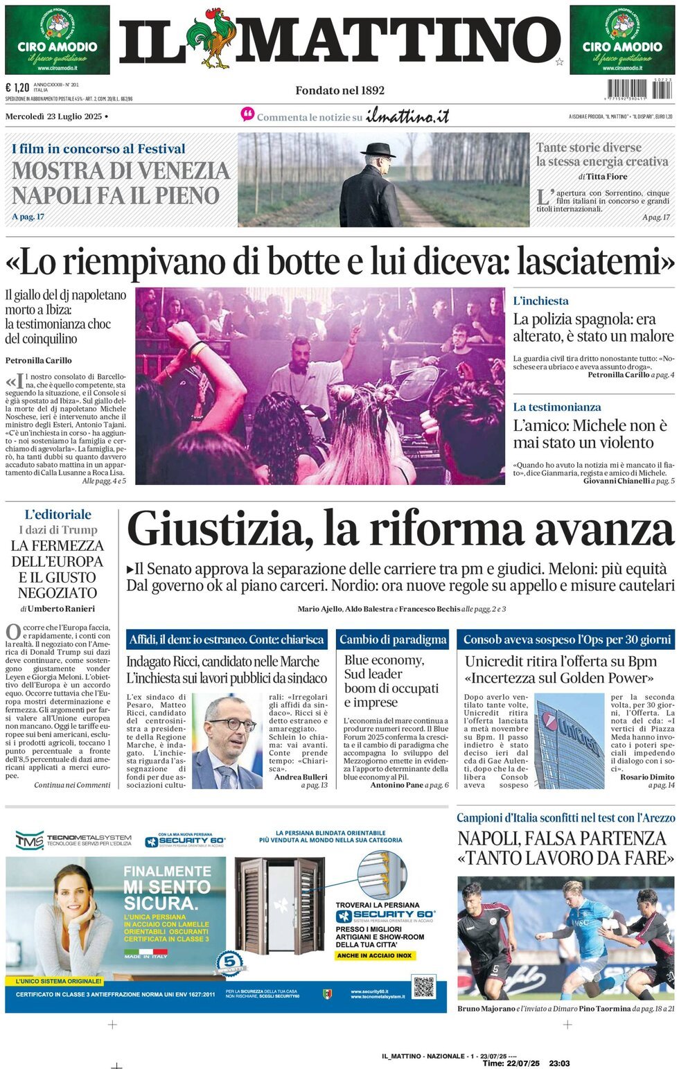 Nell'edizione di oggi, Il Mattino dedica spazio al Napoli che perde 2-0 all'esordio stagionale nella prima amichevole del ritiro di Dimaro contro l'Arezzo: "Napoli, falsa partenza: "Tanto lavoro da fare". In apertura l'approvazione del Senato alla separazione delle carriere tra pm e giudici: "Giustizia, la riforma avanza". Di seguito la prima pagina integrale.