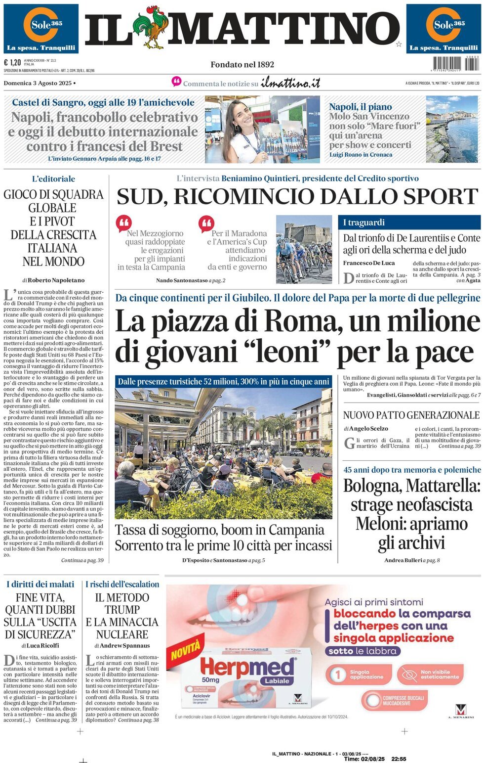 Nell'edizione di oggi, Il Mattino dedica spazio in taglio alto in prima pagina al Napoli, che stasera scende in campo allo Stadio Patini per il primo test amichevole del ritiro di Castel di Sangro: "Napoli, francobollo celebrativo e oggi il debutto internazionale contro i francesi del Brest". A centro pagina il boom di presenze turistiche in Campania: "Tassa di soggiorno, boom in Campania. Sorrento tra le prime 10 città per gli incassi". Di seguito la prima pagina integrale.