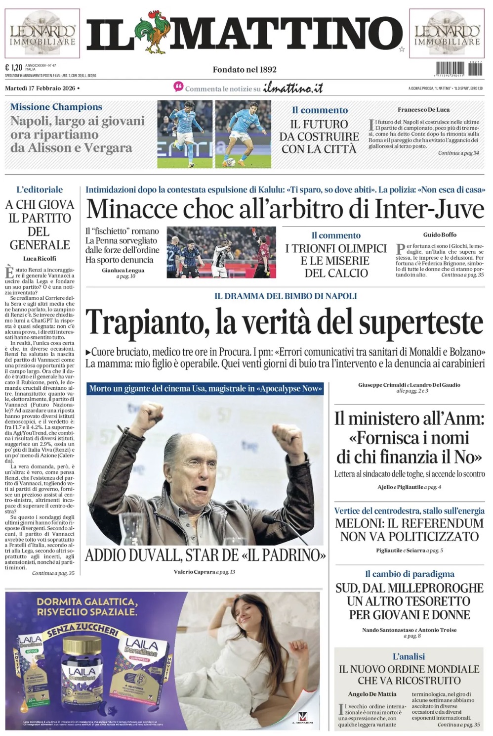 "Napoli, largo ai giovani: ora ripartiamo da Alisson e Vergara", scrive così nel taglio alto della prima pagina Il Mattino nell'edizione odierna, citando due protagonisti azzurri dell'ultimo periodo. Al centro, spazio alla vicenda spiacevole che vede vittima il fischietto La Penna: "Minacce choc all'arbitro di Inter-Juve. Intimidazioni dopo la contestata espulsione di Kalulu: 'Ti sparo, so dove abiti'. La polizia: 'Non esca di casa'". Di seguito la prima pagina integrale.