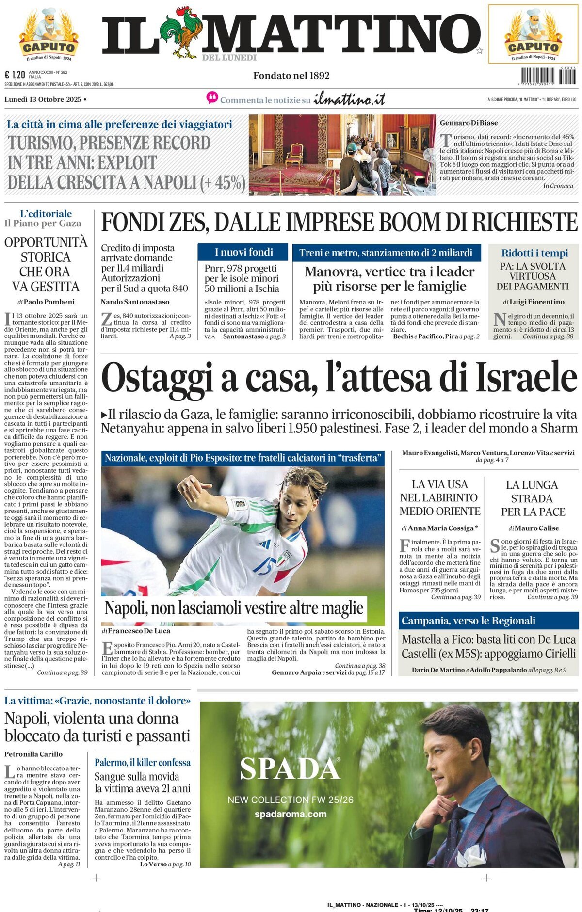 Nell'edizione di oggi, Il Mattino dà spazio in prima pagina ai tre fratelli napoletani Esposito: "Napoli, non lasciamoli vestire altre maglie. Nazionale, exploit di Pio Esposito: tra fratelli calciatori in 'trasferta'". In apertura l'attesa per il rilascio degli ostagi israeliani a Gaza: "Ostaggi a casa, l'attesa di Israele". Di seguito la prima pagina integrale.