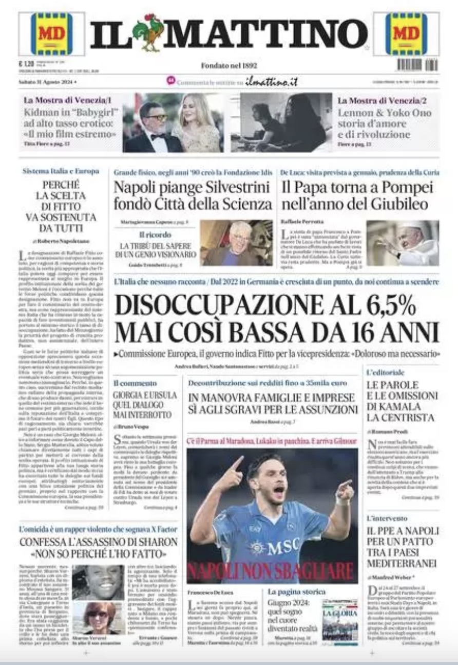 "Napoli non sbagliare. C'è il Parma al Maradona, Lukaku in panchina. E arriva Gilmour", scrive così in prima pagina l'edizione odierna de Il Mattino. Il quotidiano campano parla della sfida che attende oggi gli azzurri in campionato, con uno spazio per i nuovi acquisti del mercato super condotto dagli uomini di De Laurentiis. Di seguito la prima pagina integrale.