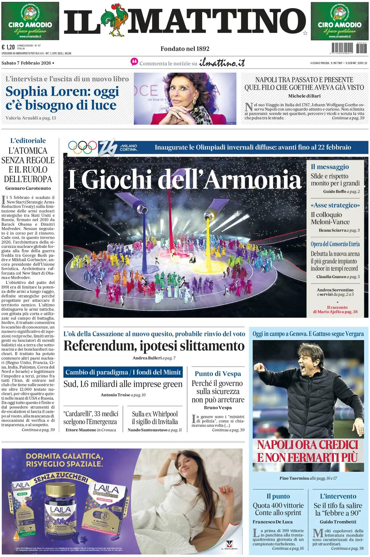 "Napoli ora credici e non fermarti più", si legge sulla prima pagina de "Il Mattino" in edicola quest'oggi. Oggi in campo a Genova il Napoli di Antonio Conte, con Vergara seguito da Gattuso per il sogno in Nazionale. Spazio in prima pagina anche per l'inaugurazione delle Olimpiadi di Milano-Cortina con "I giochi dell'Armonia".