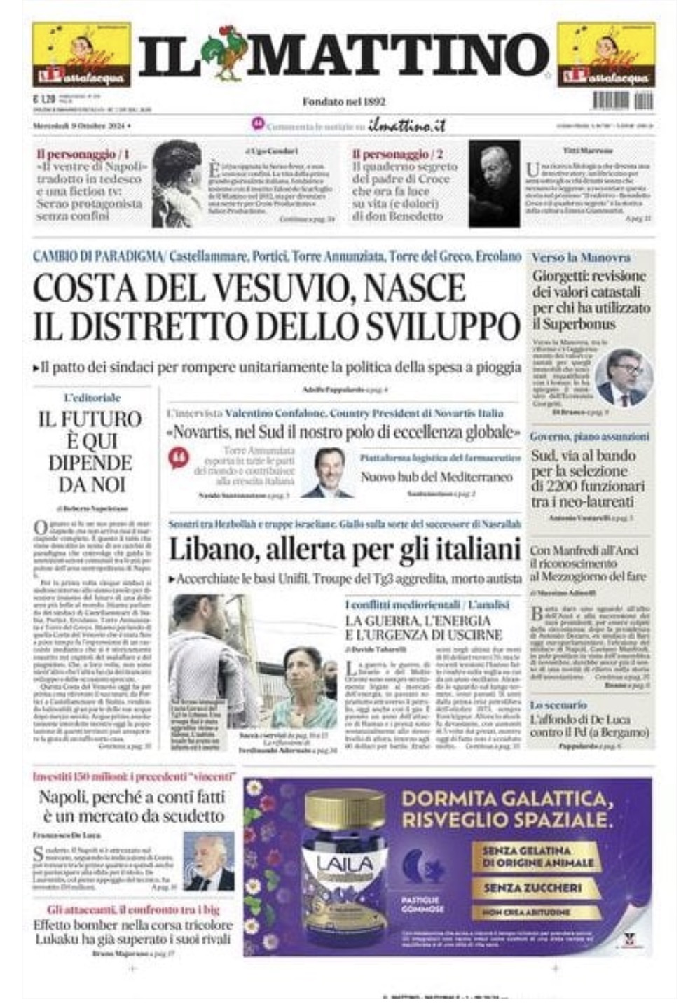 "Napoli, perché a conti fatti è un mercato da scudetto", scrive così in prima pagina l'edizione odierna de Il Mattino, parlando delle operazioni di successo della società azzurra nel calciomercato estivo. Il sommario: "Investiti 150 milioni: i precedenti «vincenti»". Un box dedica spazio al nuovo centravanti di Antonio Conte: "Gli attaccanti, il confronto tra i big. Effetto bomber nella corsa tricolore: Lukaku ha già superato i suoi rivali". Di seguito la prima pagina integrale