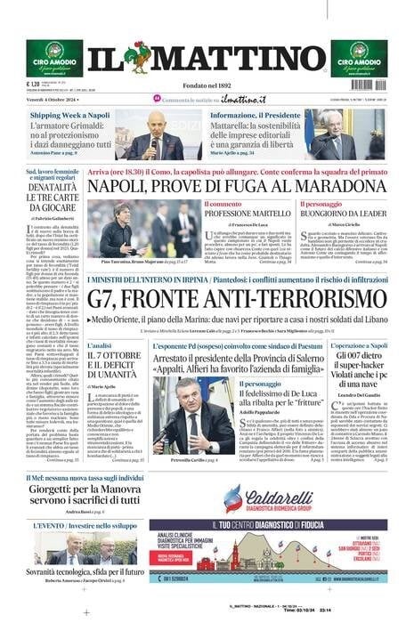 Nell'edizione di oggi, Il Mattino apre in prima pagina con il Napoli che può allungare al comando in classifica nell'anticipo di stasera contro il Como: "Napoli, prove di fuga al Maradona. Arriva (18.30) il Como, la capolista può allungare: Conte conferma la squadra del primato". Di seguito la prima pagina integrale.