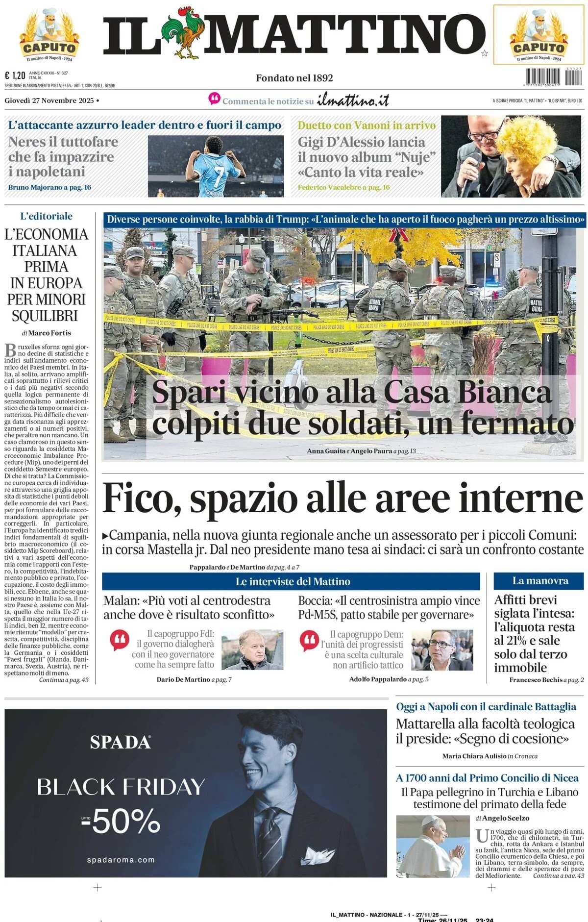 Nell'edizione di oggi, Il Mattino dà spazio in prima pagina all'attaccante del Napoli David Neres, tra i protagonisti delle ultime due vittorie degli azzurri: "Neres il tuttofare che fa impazzire i napoletani. L'attaccante azzurro leader dentro e fuori il campo". In apertura l'attentato che ha spaventato la Casa Bianca: "Spari vicino alla Casa Bianca: colpiti due soldati, un fermato". Di seguito la prima pagina integrale.