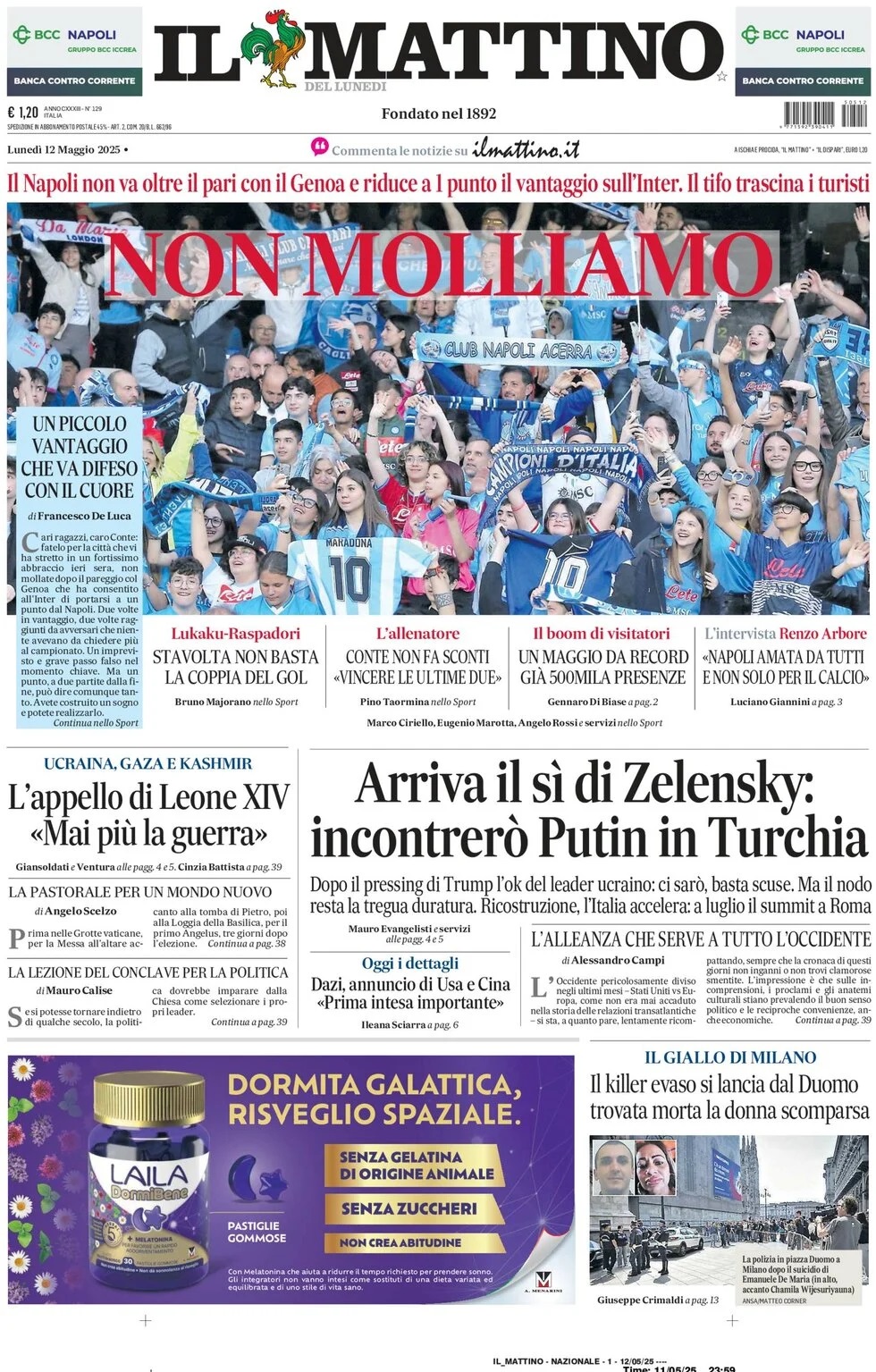 Nell'edizione di oggi, Il Mattino dedica l'apertura in prima pagina al 2-2 del Napoli col Genoa: "Non molliamo. Il Napoli non va oltre il pari con il Genoa e riduce a 1 punto il vantaggio sull'Inter. Il tifo trascina i turisti". Di seguito la prima pagina integrale.