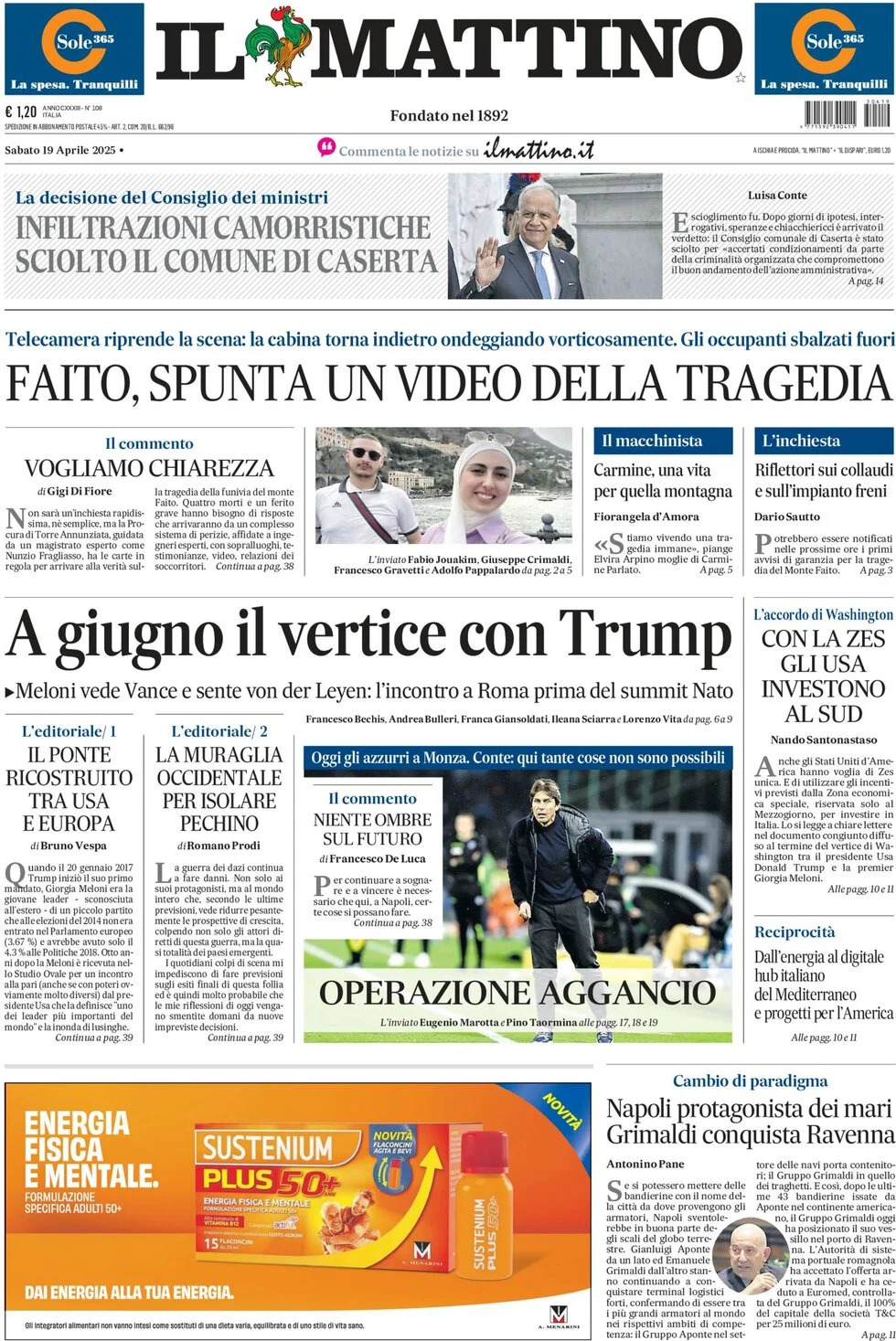 "Operazione aggancio" questo il titolo della prima pagina odierna a firma Il Mattino. Il riferimento è alla partita di oggi tra Napoli e Monza. Con una vittoria gli azzurri di Conte potrebbero agganciare l'Inter atteso domani dalla difficile sfida contro il Bologna.
