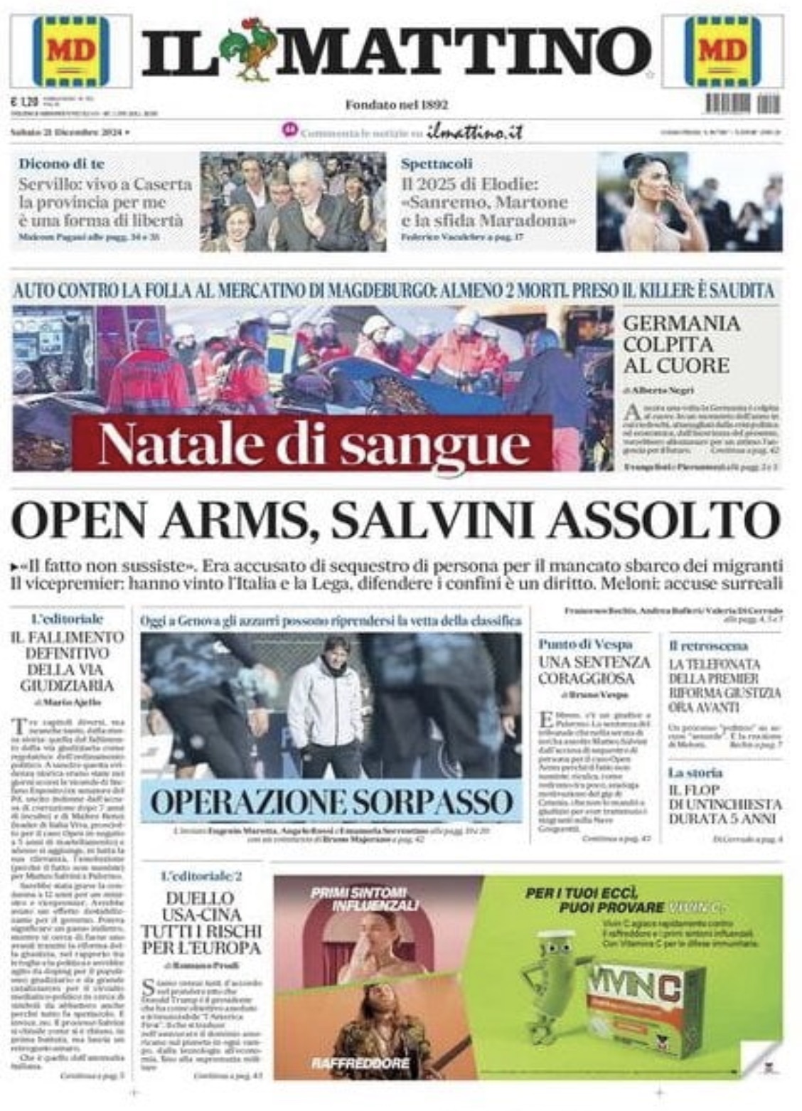 "Operazione sorpasso", apre così in prima pagina Il Mattino nell'edizione odierna, parlando della chance che ha il Napoli per superare - almeno momentaneamente - l'Atalanta al primo posto. Il sommario: "Oggi a Genova gli azzurri possono riprendersi la vetta della classifica". Di seguito la prima pagina integrale.