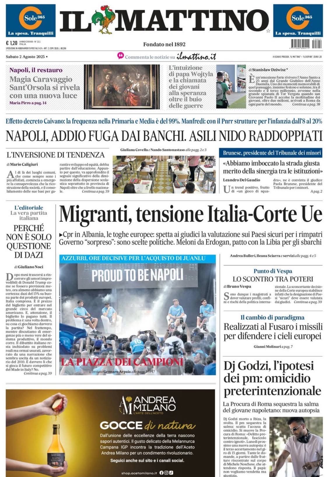 “La piazza dei campioni”, titola a centro pagina il quotidiano partenopeo Il Mattino per raccontare della serata a Castel di Sangro con quattro azzurri protagonisti e che vi abbiamo raccontato live. Nel sommario però anche un flash di mercato: “Azzurri, ore decisive per l’acquisto di Juanlu Sanchez”, nonostante i rumors di ieri su un inserimento del Wolverhampton. Di seguito la prima pagina integrale