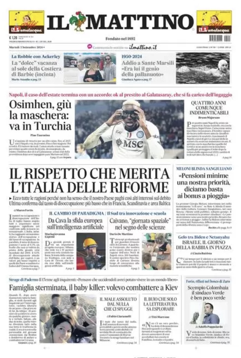 "Osimhen, giù la maschera: va in Turchia", scrive così nell'edizione odierna Il Mattino, parlando del trasferimento del bomber nigeriano al Galatasaray. Il sommario: "Napoli, il caso dell'estate termina con un accordo: ok al prestito al Galatasaray, che si fa carico dell'ingaggio". Di seguito la prima pagina integrale.