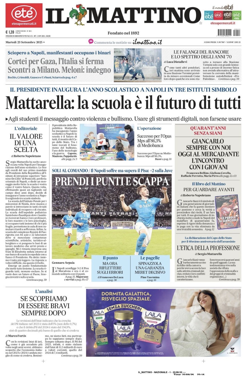 "Prendi i punti e scappa", apre così in prima pagina Il Mattino nell'edizione odierna, parlando del successo della squadra di Antonio Conte che va in fuga solitaria in vetta al campionato. Il sommario: "Soli al comando. Il Napoli soffre ma supera il Pisa: +2 sulla Juve". Di seguito la prima pagina integrale.