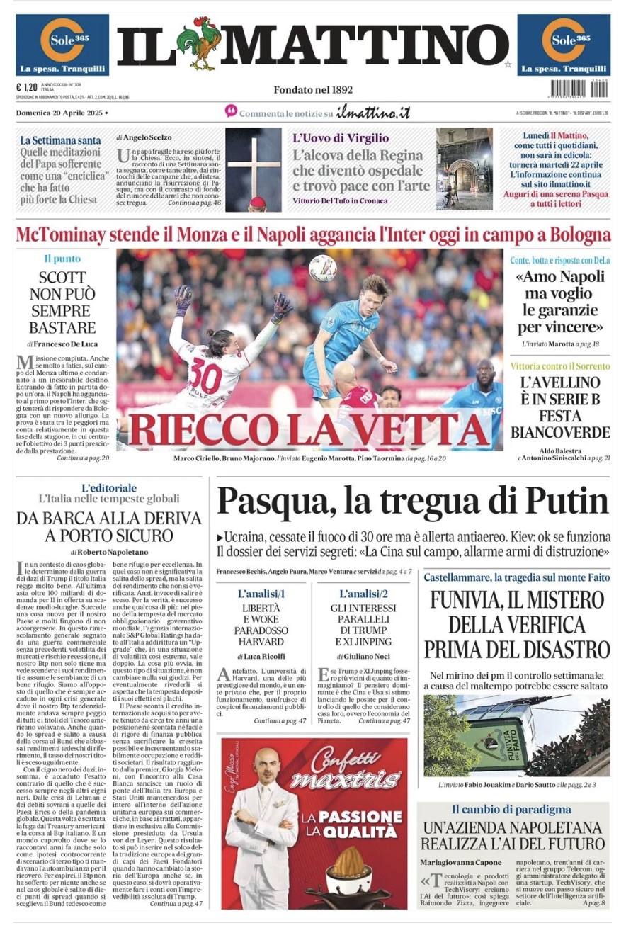 "Riecco la vetta", apre così in prima pagina Il Mattino nell'edizione odierna, celebrando il successo in trasferta degli azzurri di Conte che sono tornati almeno momentaneamente in testa alla classifica. Il sommario: "McTominay stende il Monza e il Napoli aggancia l'Inter, oggi in campo a Bologna". Di seguito la prima pagina integrale.