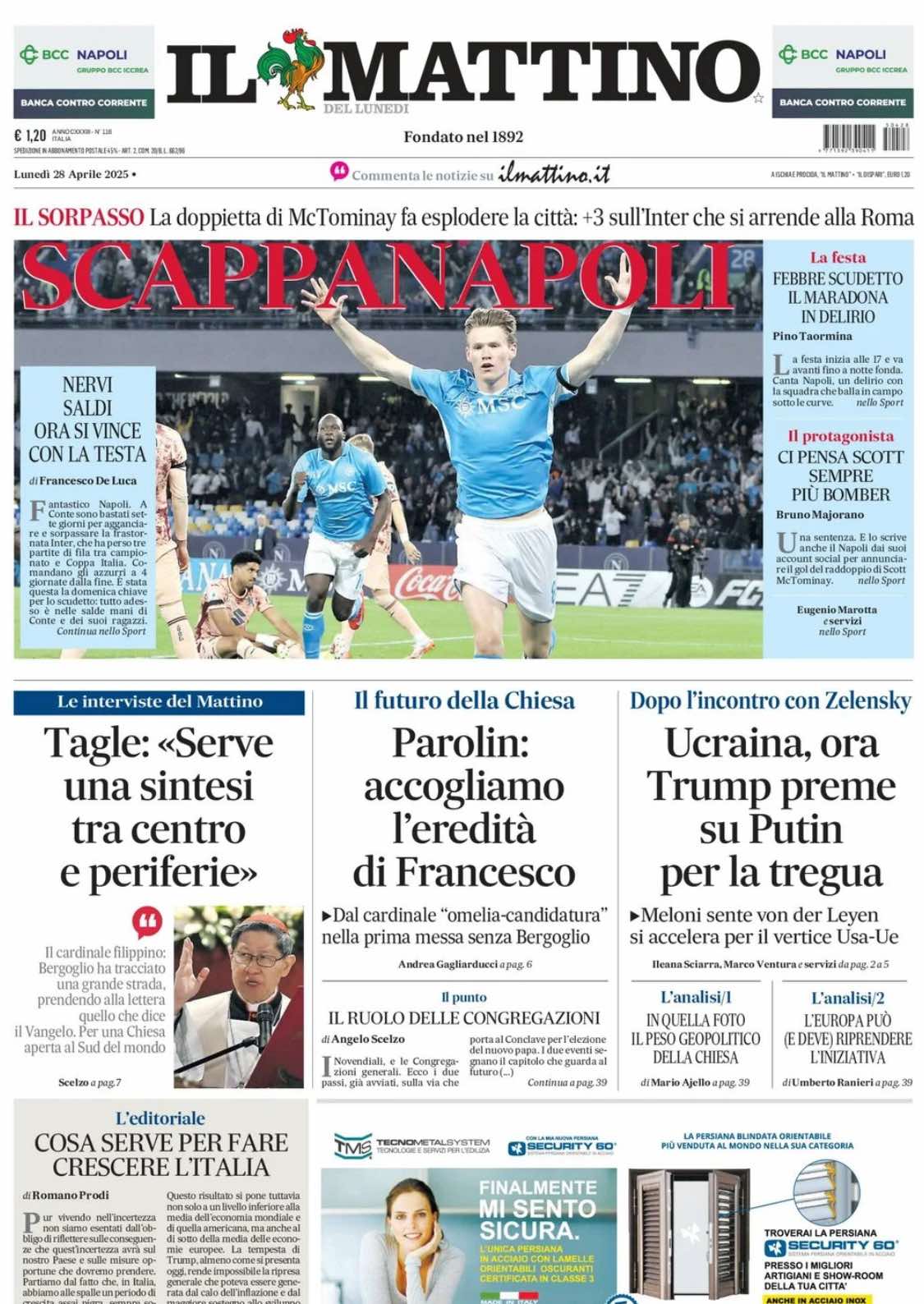 Nell'edizione di oggi, Il Mattino apre in prima pagina con la vittoria del Napoli contro il Torino che manda gli azzurri in fuga in vetta alla classifica: "ScappaNapoli. La doppietta di McTominay fa esplodere la città: +3 sull'Inter che si arrende alla Roma". Di spalla in fondo di De Luca: "Nervi saldi, ora si vince con la testa". Di seguito la prima pagina integrale.