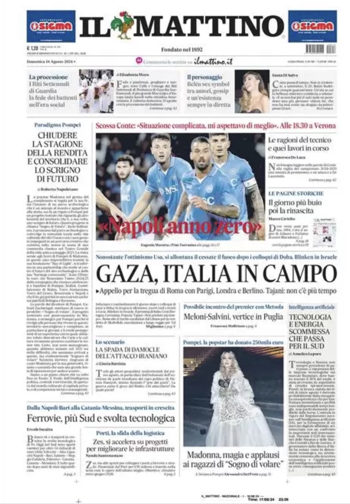 "Napoli anno zero. Scossa Conte: 'Situazione complicata, mi aspettavo di meglio'. Alle 18.30 a Verona", apre così in prima pagina l'edizione odierna de Il Mattino, commentando le parole di Antonio Conte in vista dell'esordio degli azzurri in campionato. Di seguito la prima pagina integrale