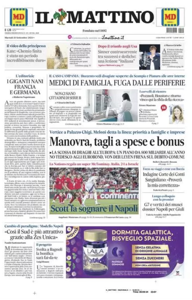 "Scott fa sognare il Napoli. La Nations League regala un super McTominay, Italia 2-1 a Israele", scrive così in prima pagina l'edizione odierna de Il Mattino, parlando del grande momento di forma del centrocampista scozzese - neo acquisto degli azzurri - che ha siglato due reti in questa sosta nazionali. Spazio anche al tennis: "Dopo il successo negli Usa. Sinner controcorrente tra successi e 'dediche': una lezione italiana". Di seguito la prima pagina integrale.