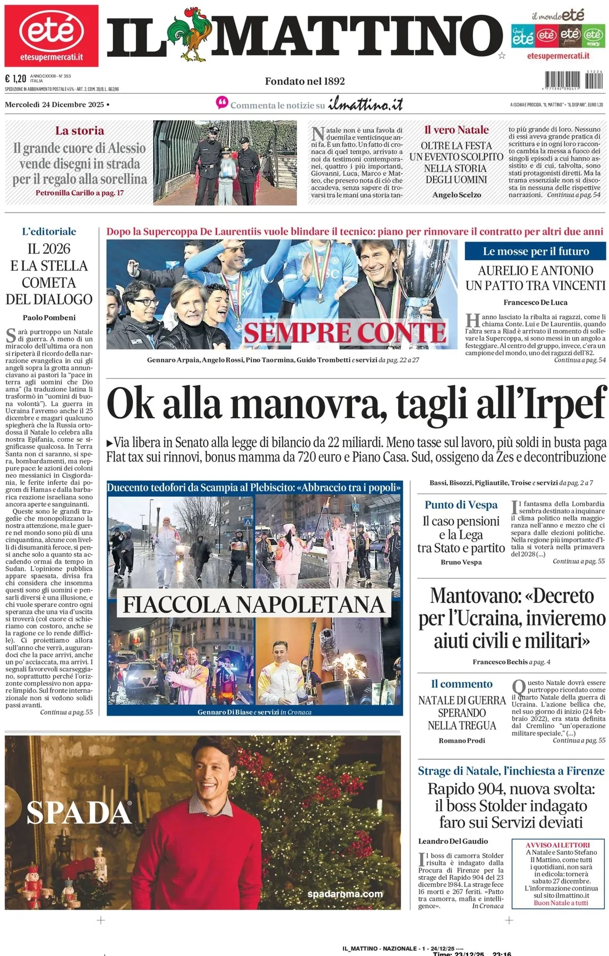 Nell'edizione di oggi, Il Mattino dedica spazio in prima pagina al Napoli di Conte, fresco vincitore della Supercoppa italiana, parlando del futuro dell'allenatore azzurro: "Sempre Conte. Dopo la Supercoppa De Laurentiis vuole blindare il tecnico: piano per rinnovare il contratto per altri due anni". Di seguito la prima pagina integrale.