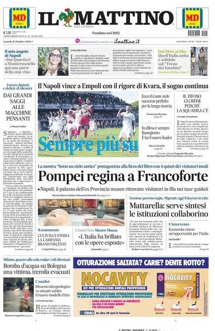 Nell'edizione di oggi, Il Mattino apre in prima pagina con la vittoria del Napoli a Empoli, che lascia invariato il distacco della capolista della inseguitrici: "Sempre più su. Il Napoli vince a Empoli col rigore di Kvara, il sogno continua". Di spalla l'editoriale del professor Guido Trombetti: "Il tifoso si crede perché la squadra c'è". Di seguito la prima pagina integrale.