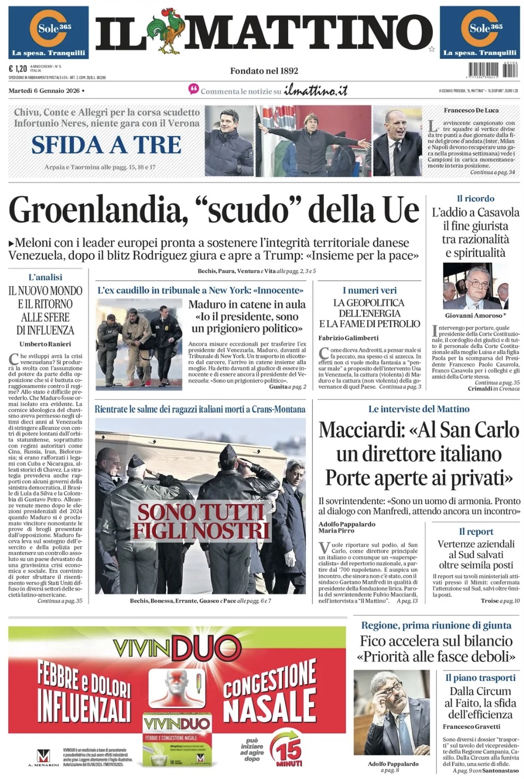 "Sfida a tre", scrive così in prima pagina Il Mattino nell'edizione odierna, parlando della lotta al vertice in Serie A. Il sommario: "Chivu, Conte e Allegri per la corsa scudetto. Infortunio Neres, niente gara con il Verona". Di seguito la prima pagina integrale.