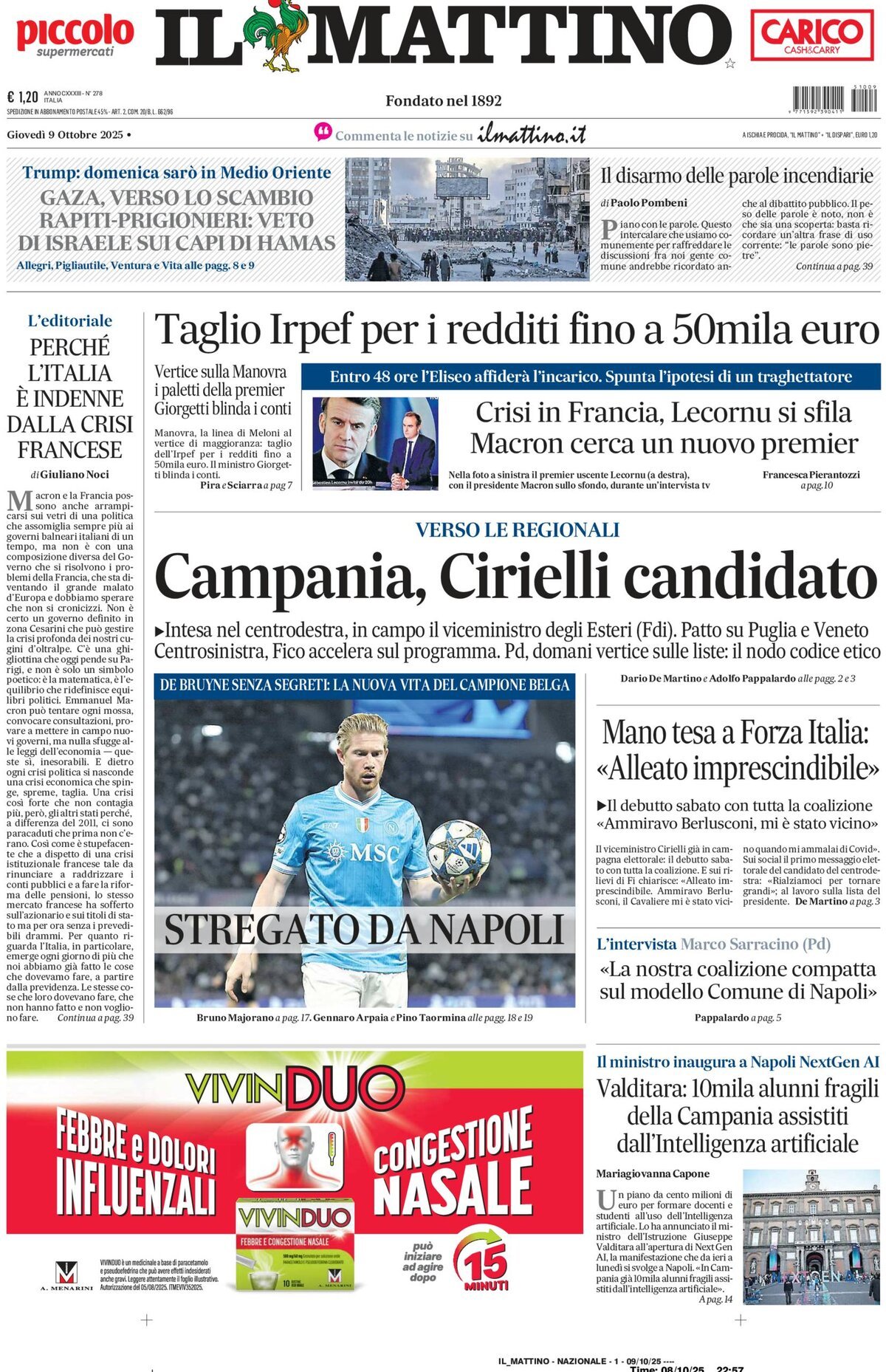 Nell'edizione di oggi, Il Mattino dedica ampio spazio in prima pagina al centrocampista azzurro Kevin De Bruyne: "Stregato da Napoli. De Bruyne senza segreti: la nuova vita del campione belga". In apertura l'intesa nel centro-destra per le prossime elezioni regionali: "Campania, Cirielli candidato". Di seguito la prima pagina integrale.