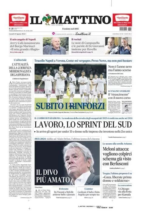 Nell'edizione di oggi, Il Mattino apre in prima pagina con il Napoli che crolla all'esordio a Verona e deve correre ai ripari sul mercato: "Subito i rinforzi. Tracollo Napoli a Verona, Conte: mi vergogno. Preso Neres, ma non può bastare". Di spalla il fondo di Francesco De Luca: "Non è l'anno zero ma l'anno scorso". Di seguito la prima pagina integrale.