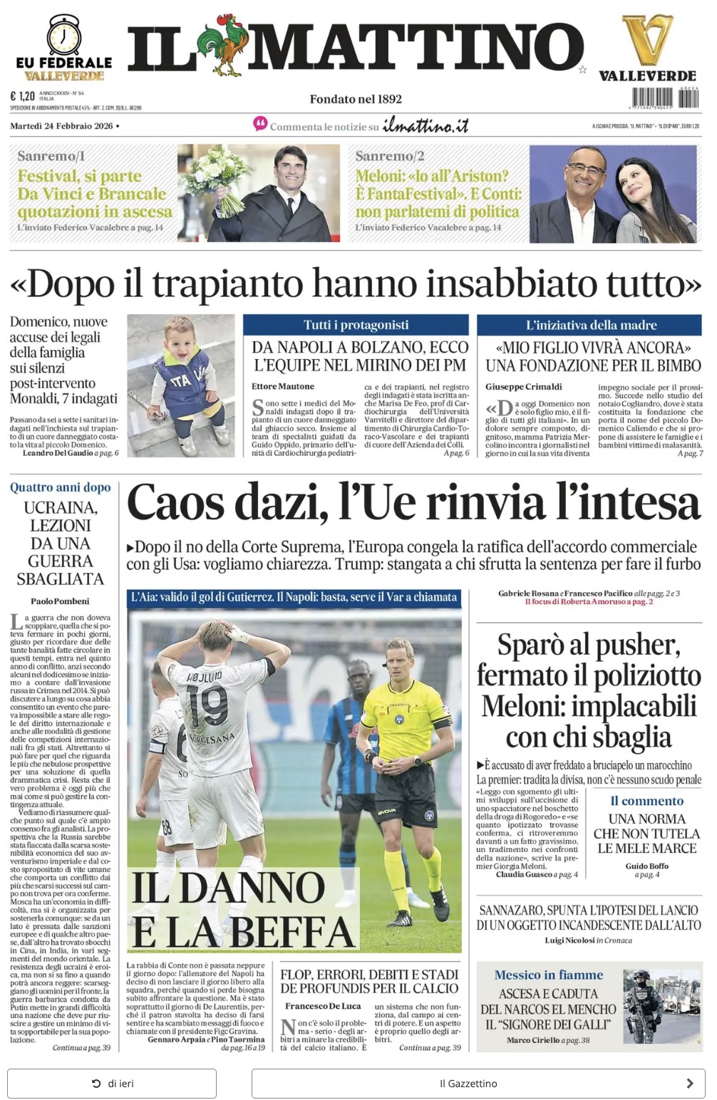 "Il danno e la beffa", apre così in prima pagina Il Mattino nell'edizione odierna, in riferimento agli errori arbitrali subiti dagli azzurri a Bergamo contro l'Atalanta. Il sommario: "L'Aia: valido il gol di Gutierrez. Il Napoli: basta, serve il Var a chiamata". Di seguito la prima pagina integrale.