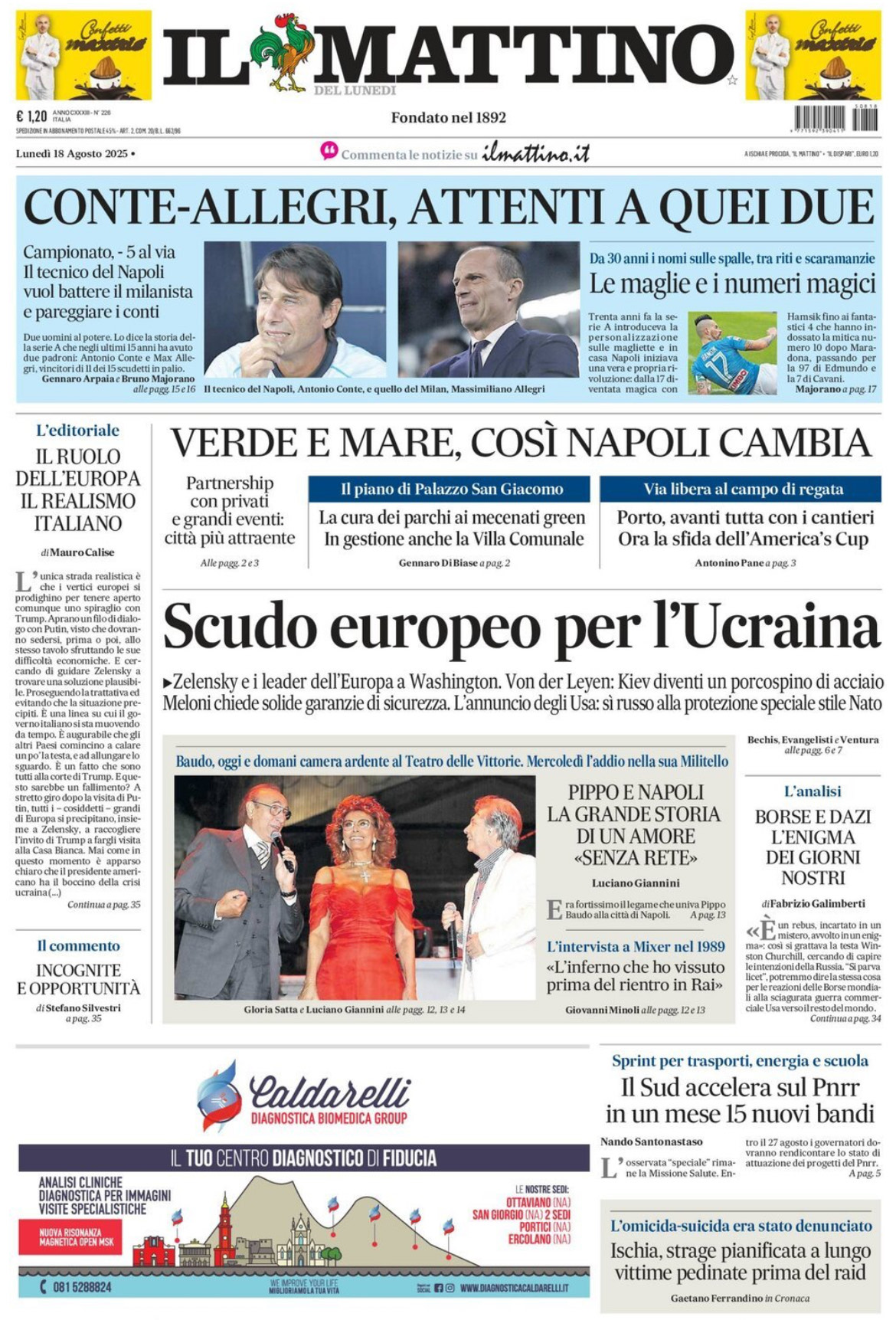 Conte e Allegri, il duello che accende la Serie A. Così scrive in prima pagina l'edizione odierna de Il Mattino sui tecnici di Napoli e Milan, titolando: "Conte-Allegri, attenti a quei due". Mancano cinque giorni al via del campionato e i riflettori si accendono subito sulla sfida tra Antonio Conte e Massimiliano Allegri.