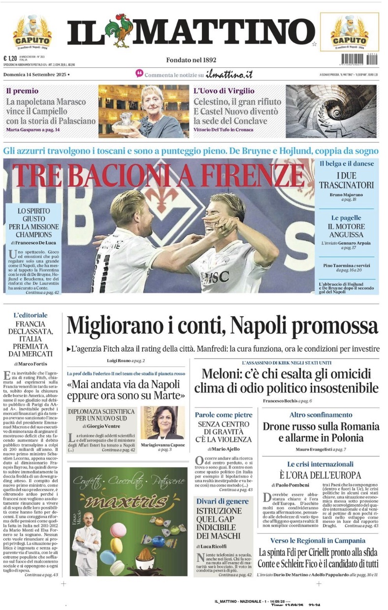"Tre bacioni a Firenze", apre così in prima pagina Il Mattino nell'edizione odierna, parlando della schiacciante vittoria del Napoli contro la Fiorentina. Il sommario: "Gli azzurri travolgono i toscani e sono a punteggio pieno. De Bruyne e Hojlund, coppia da sogno". Di seguito la prima pagina integrale.