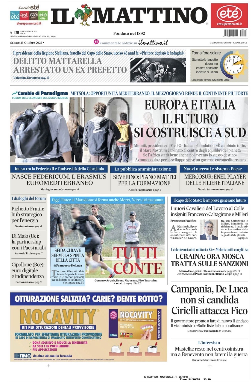 "Tutti Con-te", apre così in prima pagina Il Mattino nell'edizione odierna, presentando la sfida del Napoli di Antonio Conte contro i nerazzurri. Il sommario: "Oggi l'Inter al Maradona: si ferma anche Meret, Neres prima punta". Di seguito la prima pagina integrale.