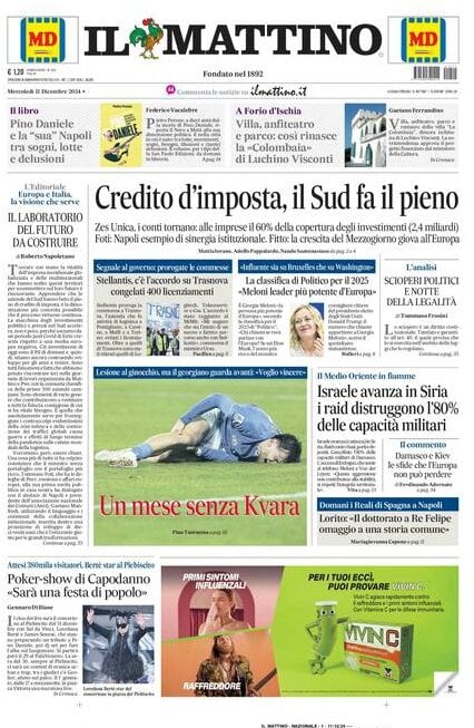 Nell'edizione di oggi, Il Mattino dedica spazio in prima pagina all'infortunio di Khvicha Kvaratskhelia: "Un mese senza Kvara. Lesione al ginocchio, ma il georgiano guarda avanti: 'Voglio vincere'". In taglio basso il concerto di Capodanno a Piazza Plebiscito: "Poker-show a Capodanno: 'Sarà una festa di popolo'". Di seguito la prima pagina integrale.