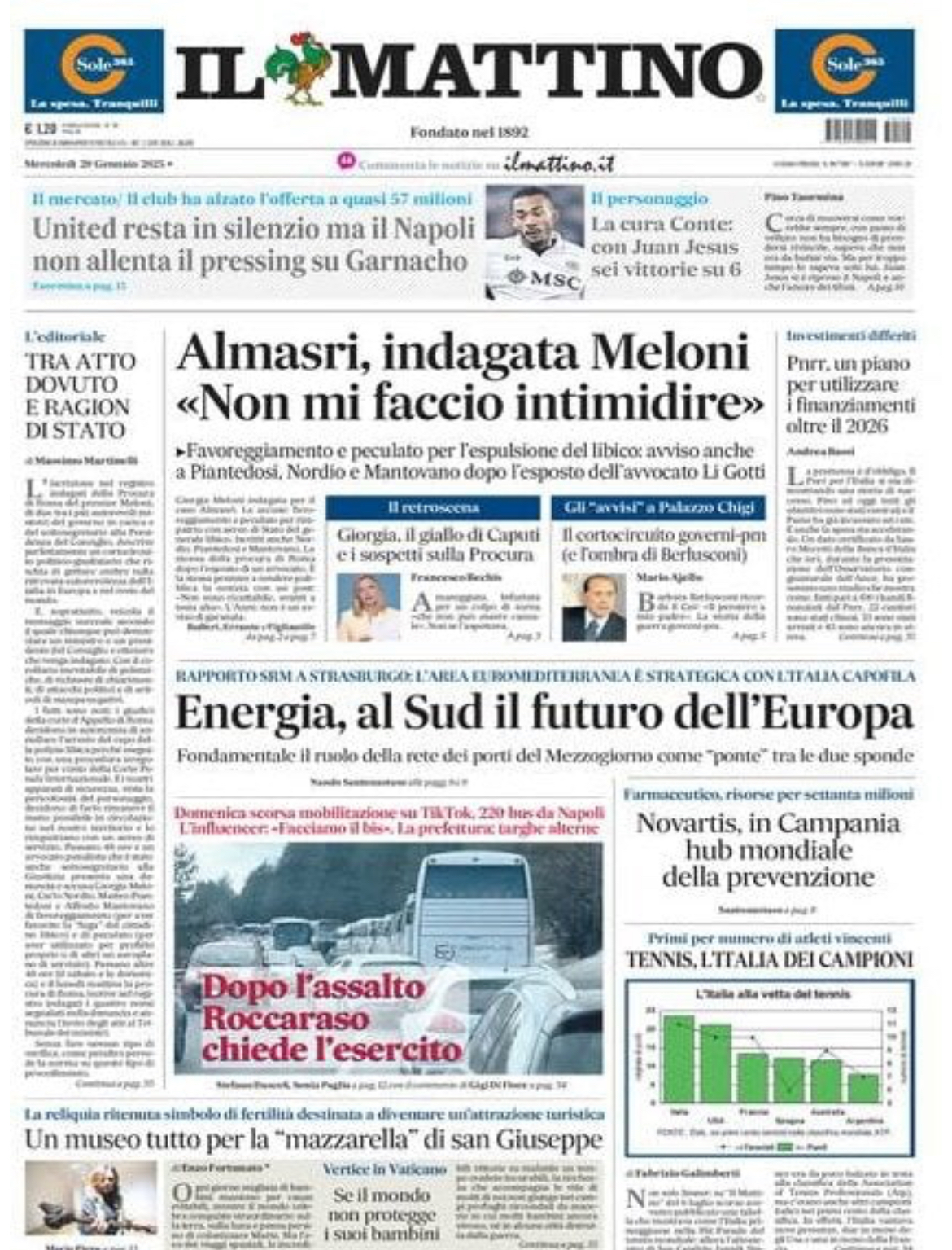 Nell'edizione di oggi, Il Mattino dedica spazio in taglio alto al mercato del Napoli e alla ricerca del sostituto di Kvaratskhelia: “United resta in silenzio ma il Napoli non allenta il pressing su Garnacho. Il club ha alzato l’offerta a quasi 57 milioni”. Di seguito la prima pagina integrale.