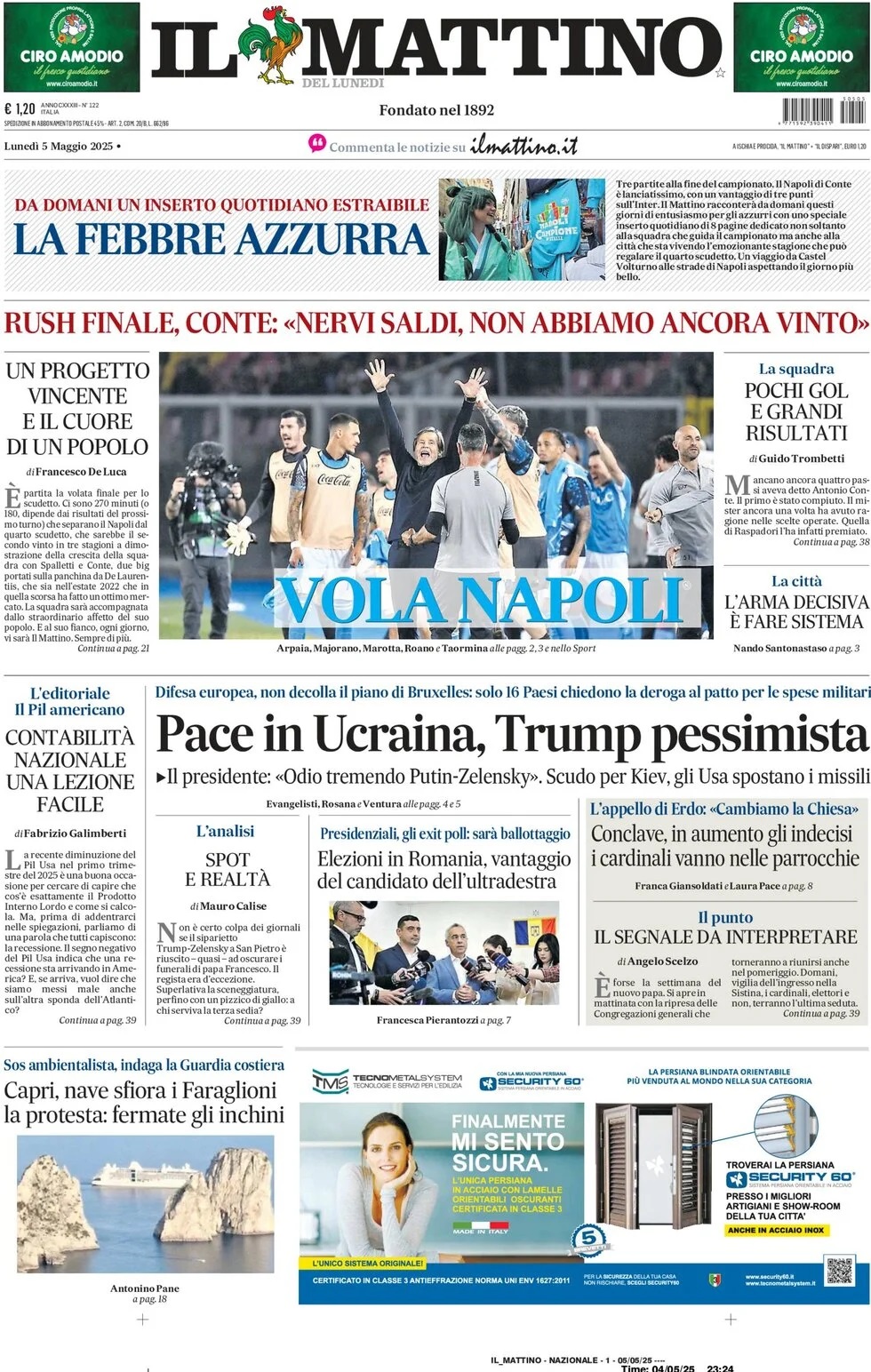 Nell'edizione odierna, Il Mattino apre in prima pagina con il Napoli capolista atteso dalle ultime tre giornate di campionato: "Vola Napoli. Rush finale, Conte: 'Nervi saldi, non abbiamo ancora vinto'". A centro pagina spazio al conflitto in Ucraina: "Pace in Ucraina, Trump pessimista". Di seguito la prima pagina integrale.