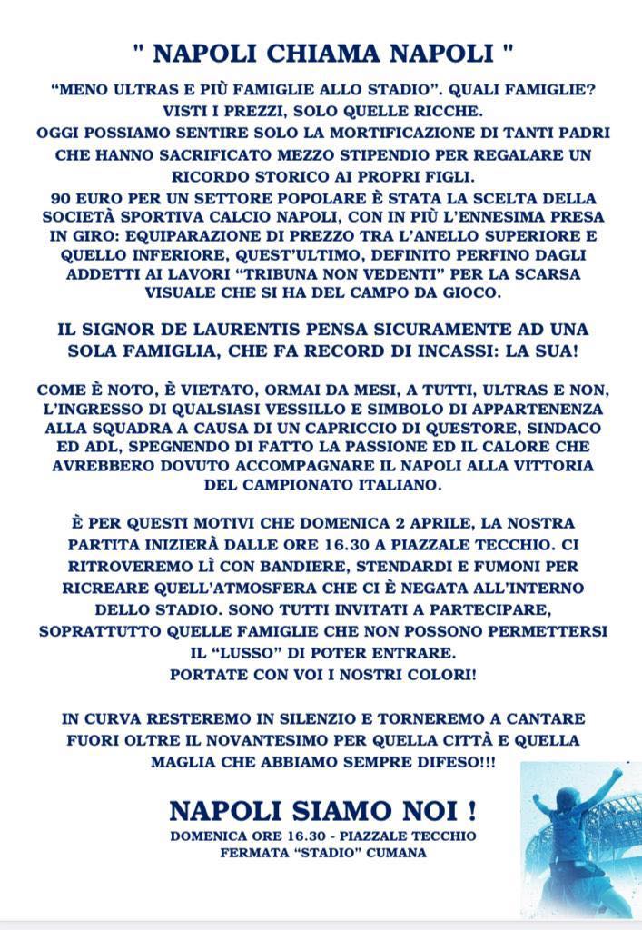 Trova spazio anche sui quotidiani quest'oggi l'ennesima protesta dei gruppi organizzati in vista di Napoli-Milan, altra gara dell'indimenticabile cavalcata degli azzurri verso il tricolore che non avrà il supporto del tifo. La Curva A in particolare ha annunciato l'ennesimo sciopero, stavolta - oltre alla solita situazione del regolamento d'uso dello stadio - a causa dei prezzi ritenuti eccessivi per la Champions. Alcuni stralci del comunicato di Curva A e Ultras 72: "Napoli chiama Napoli. "Meno ultras e più famiglie allo stadio". Quali famiglie? Visti i prezzi, solo quelle ricche. Oggi possiamo sentire solo la mortificazione di tanti padri che hanno sacrificato mezzo stipendio per regalare un ricordo storico ai propri figli. 90 euro per un settore popolare è stata la scelta della Società Sportiva Calcio Napoli. Il signor De Laurentiis pensa sicuramente ad una sola famiglia, che fa record di incassi: la sua!".